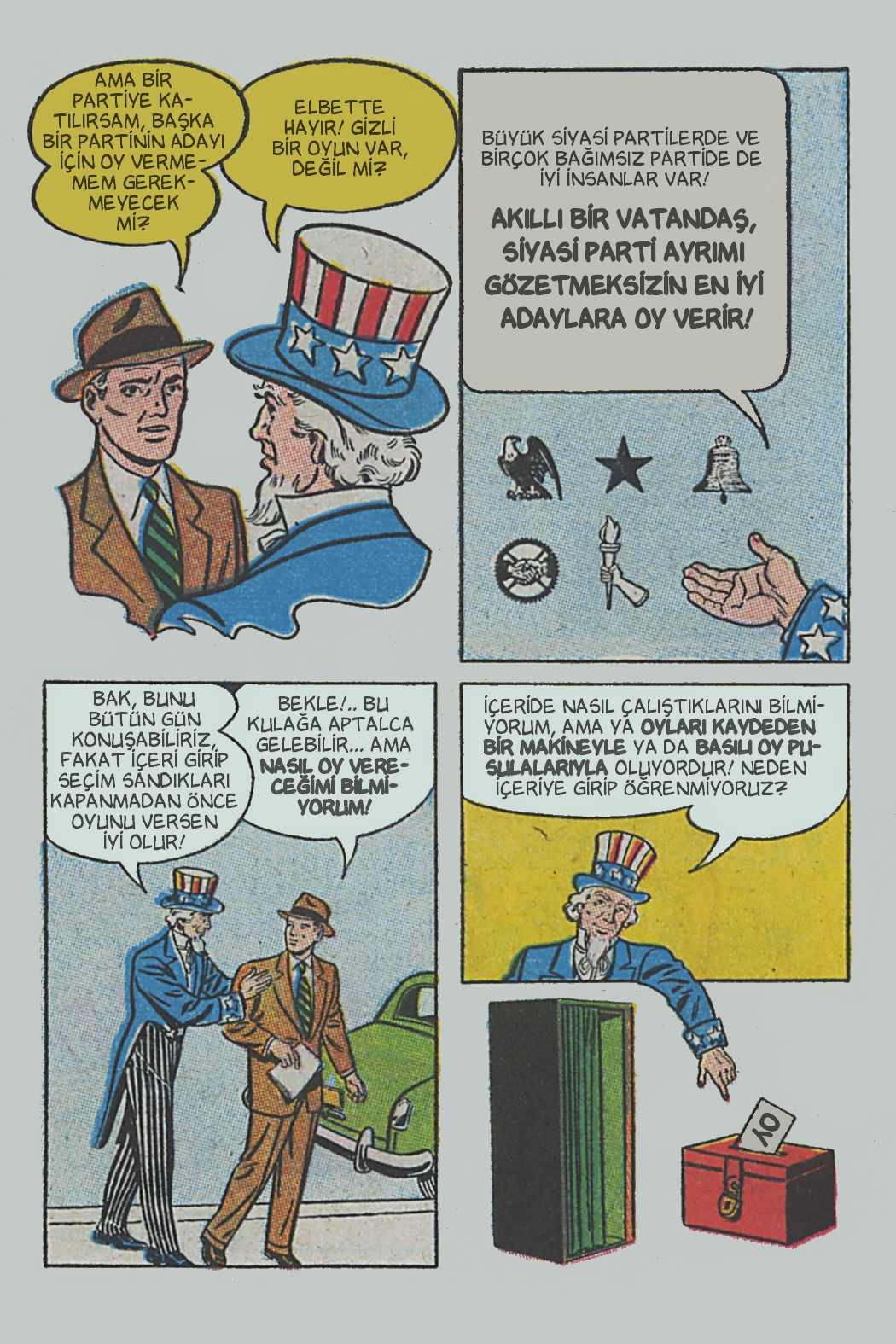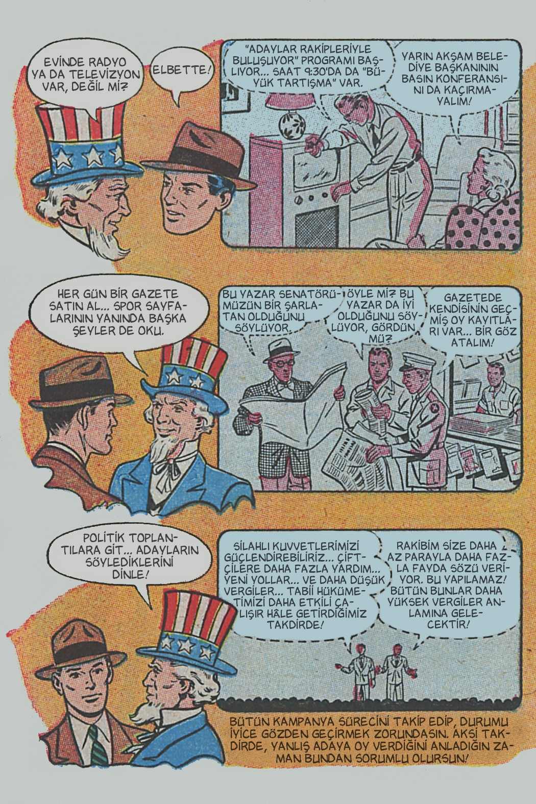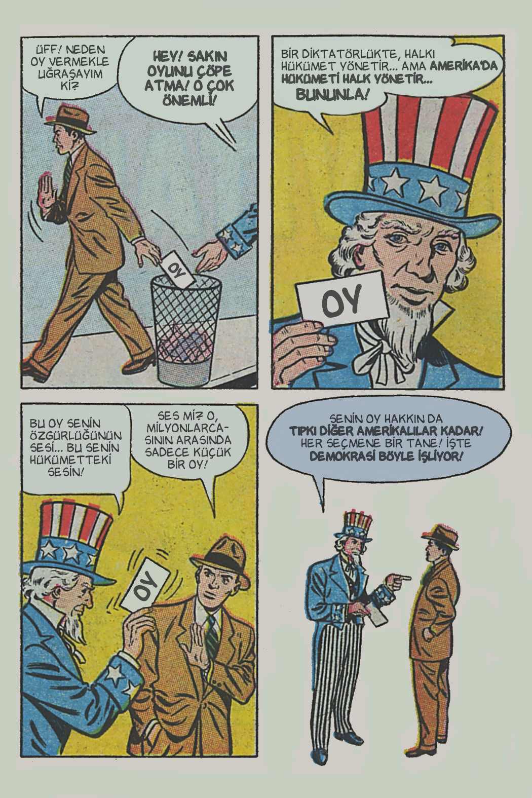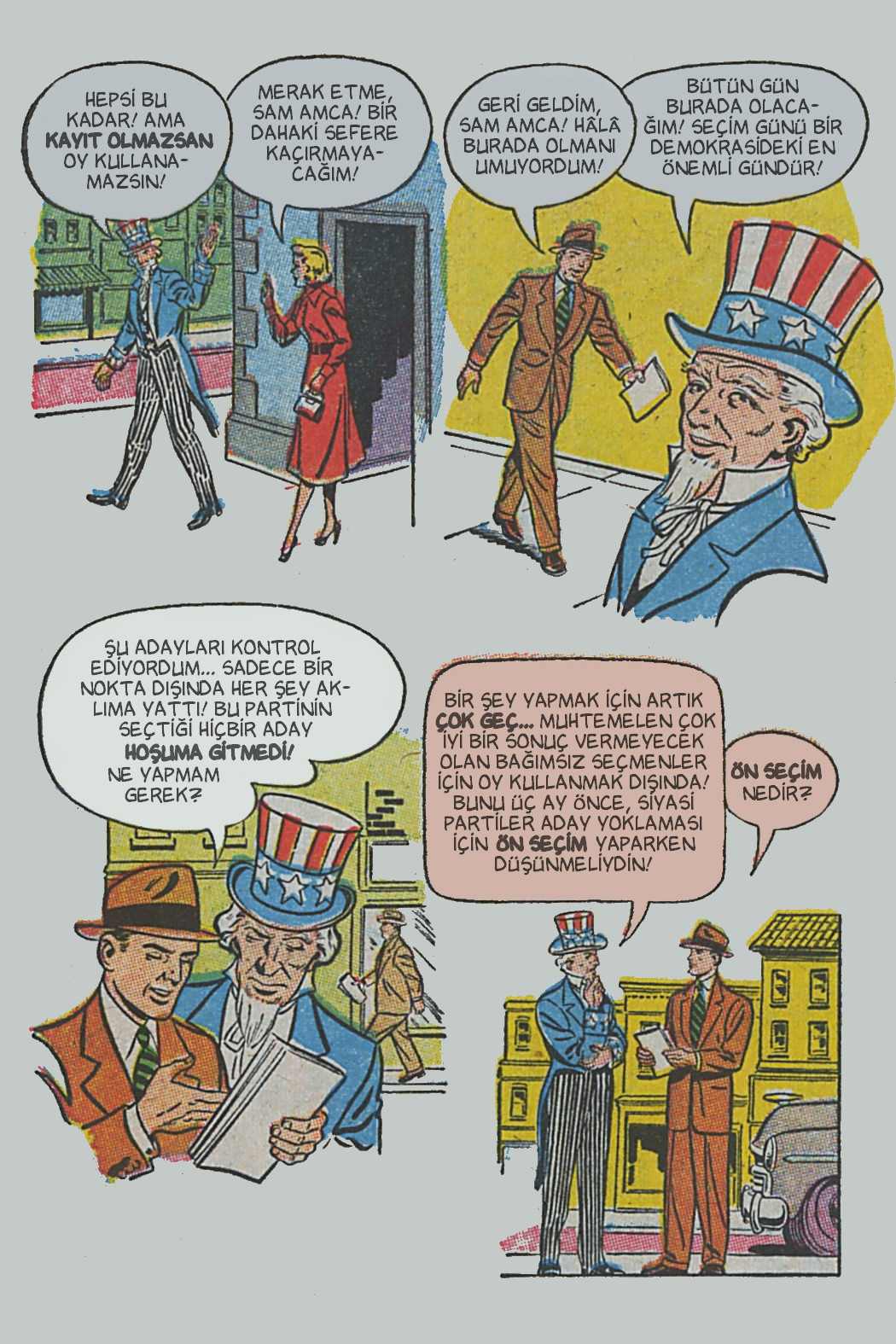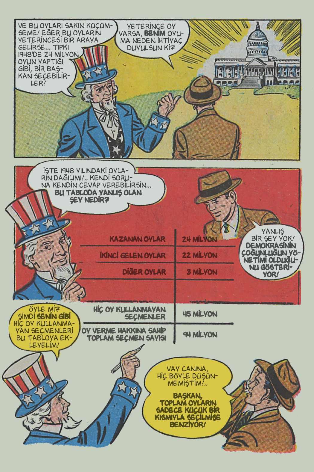Çizgi öyküde genel hatlarıyla seçimin, seçmenlerin ve