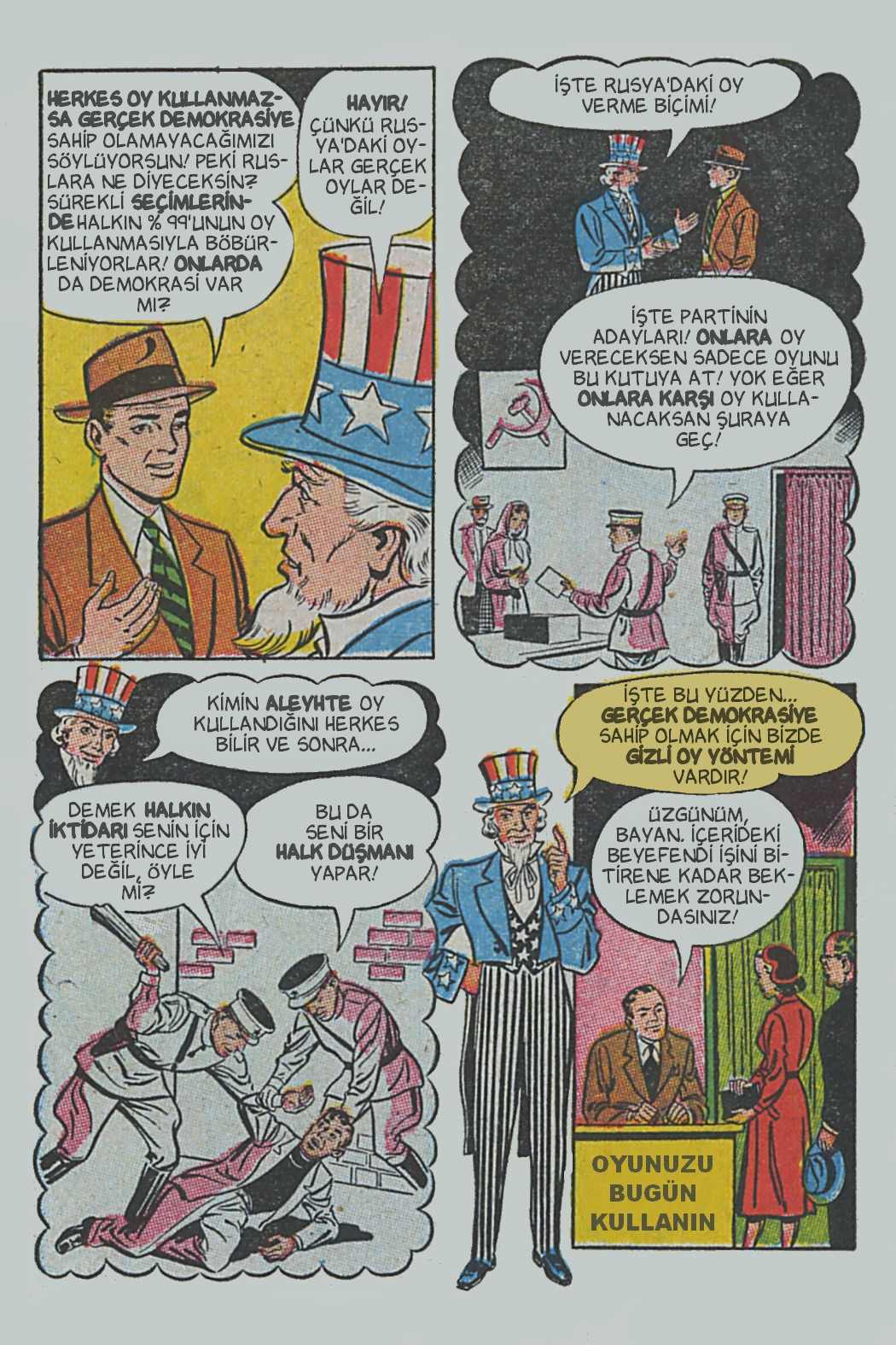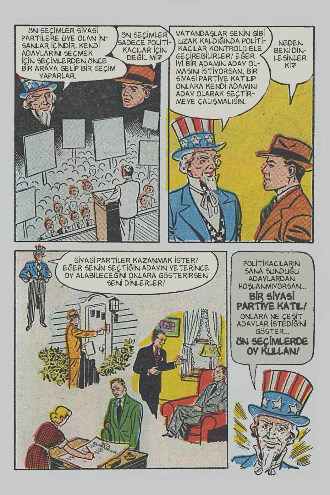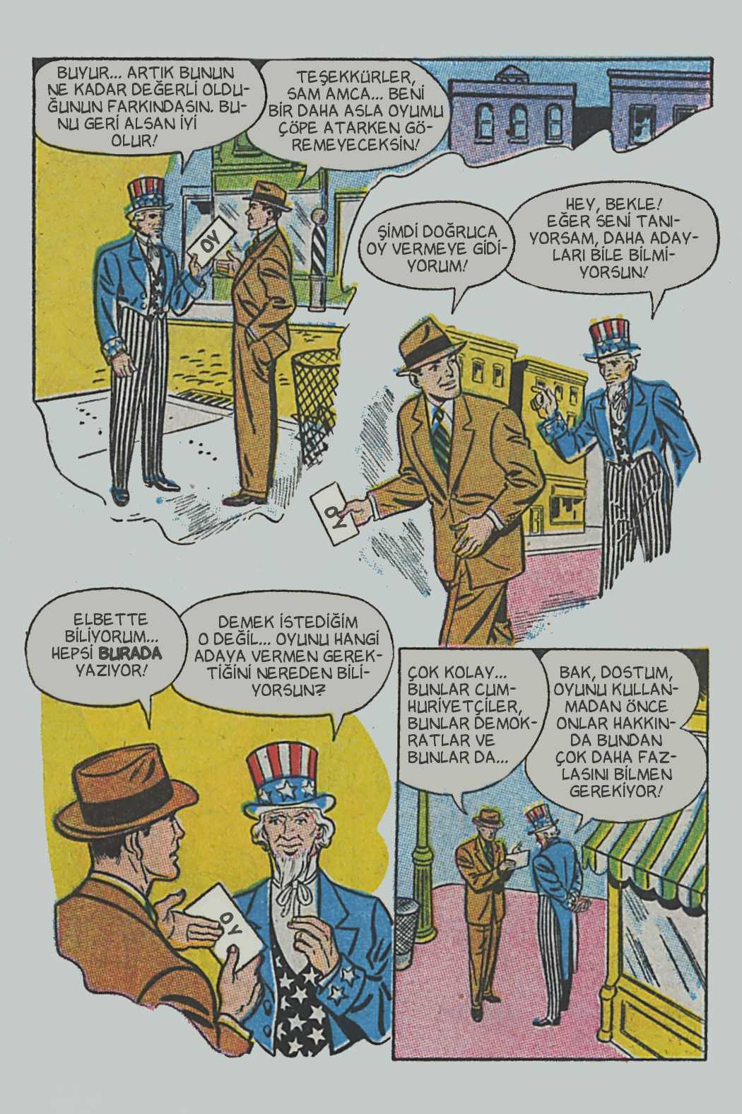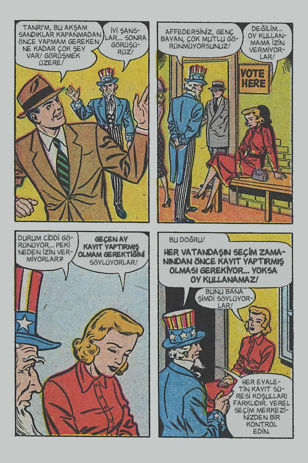 Çizgi öyküde genel hatlarıyla seçimin, seçmenlerin ve