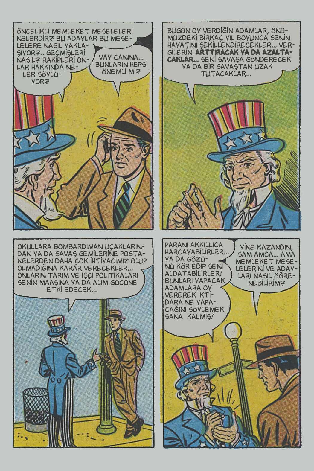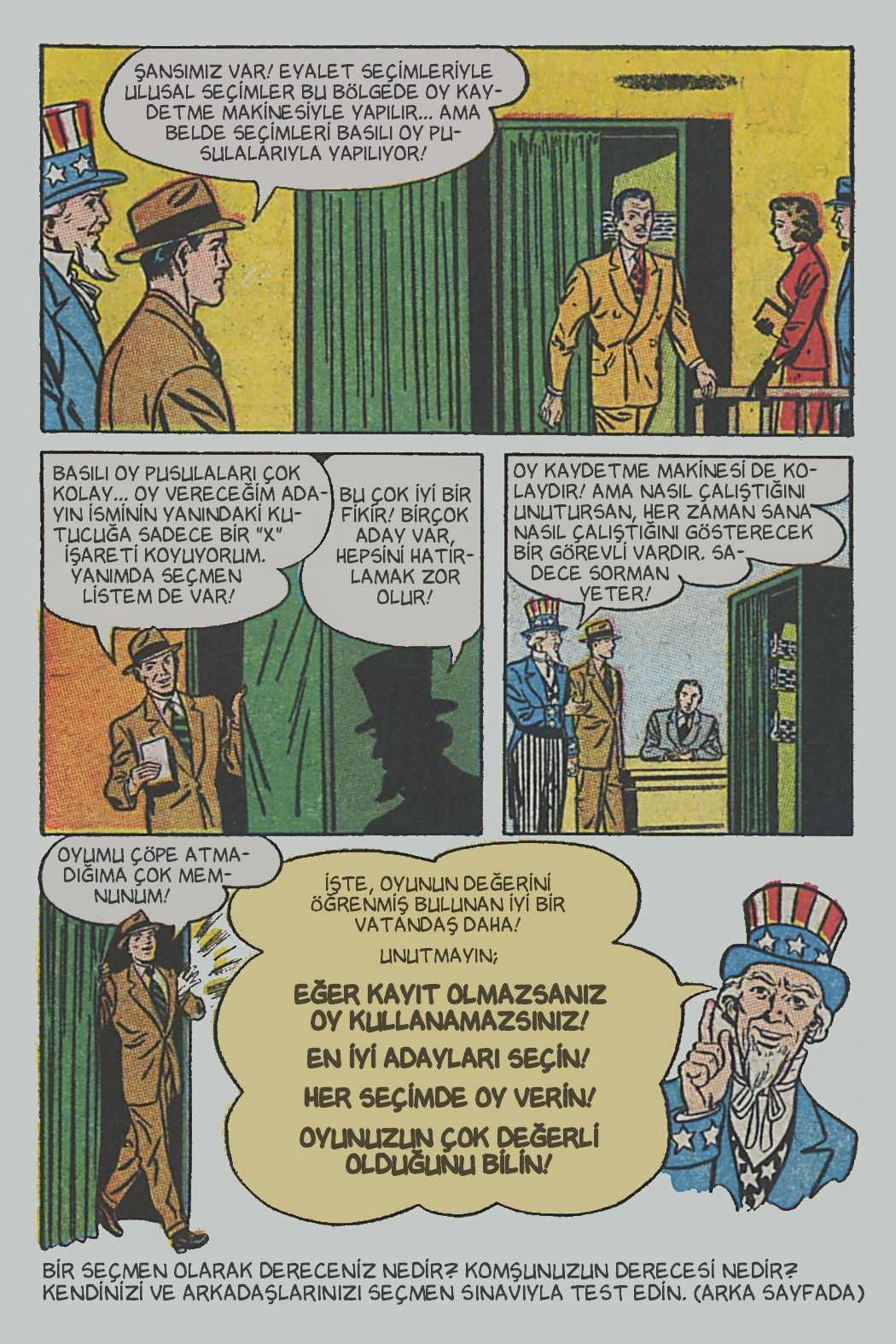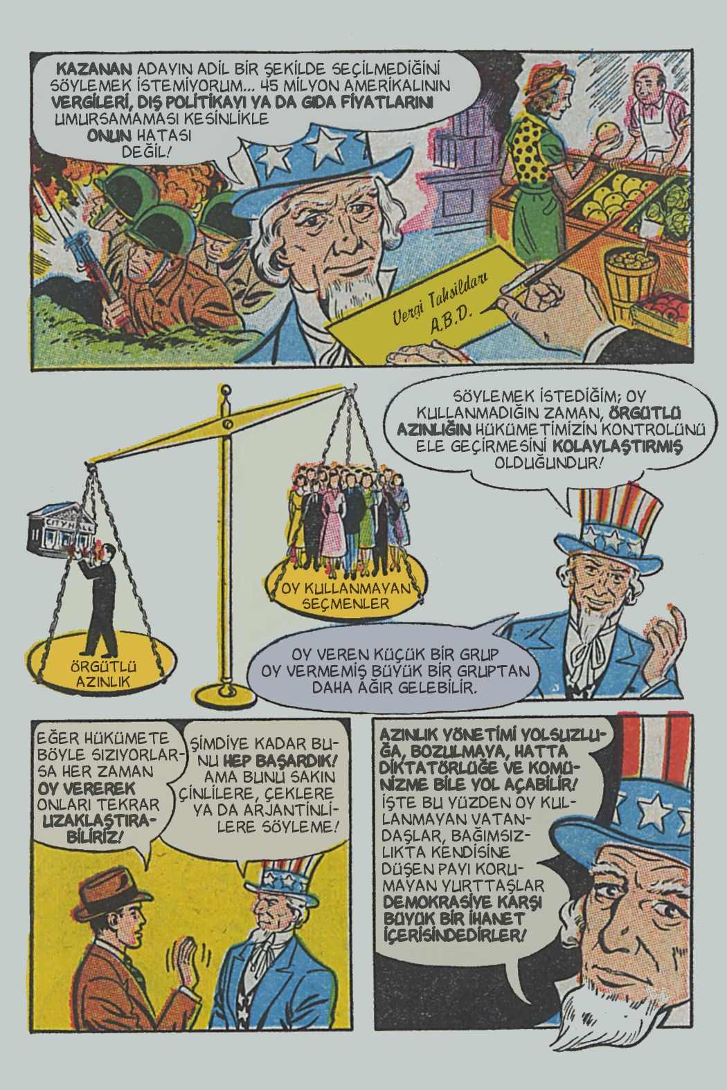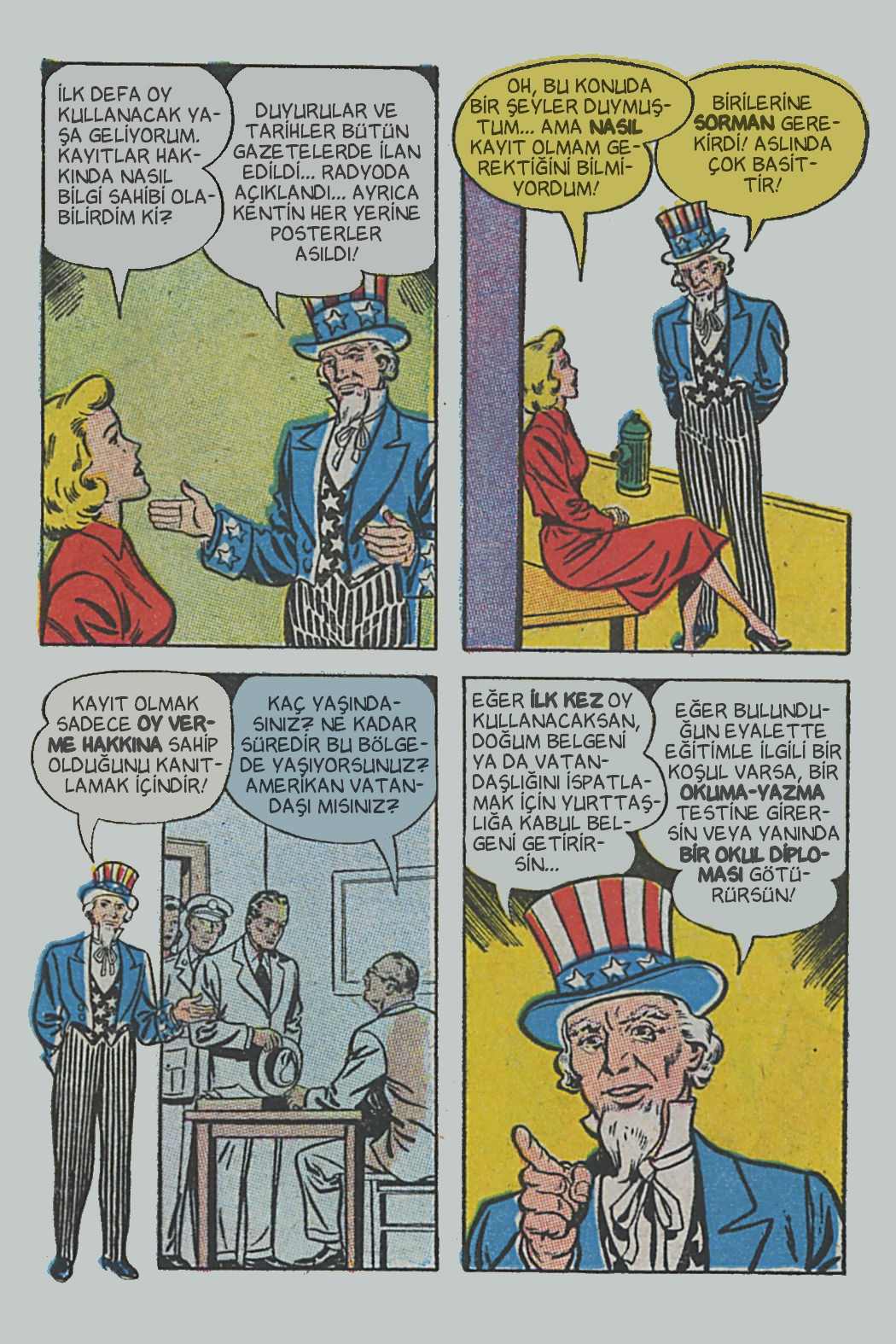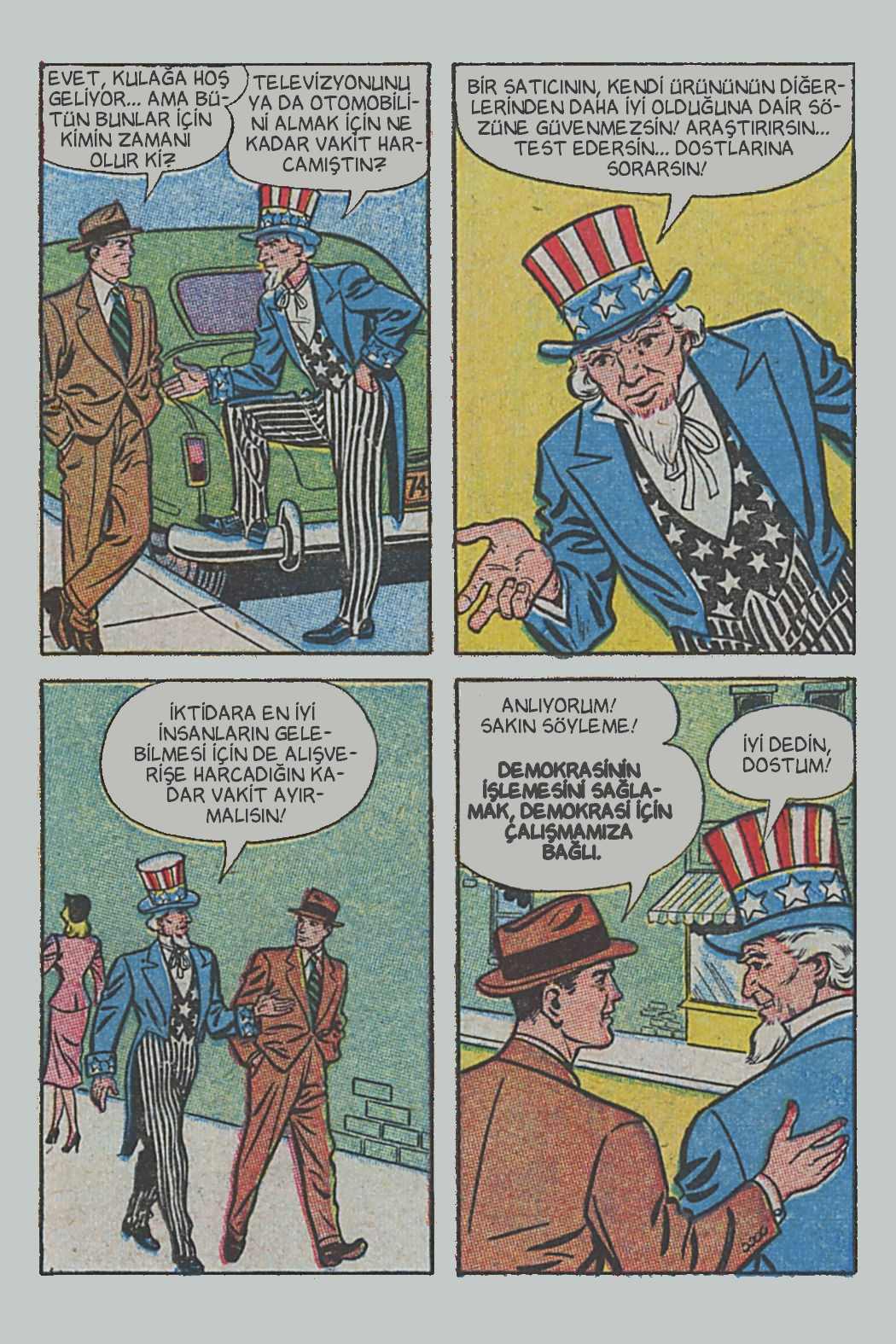 Çizgi öyküde genel hatlarıyla seçimin, seçmenlerin ve