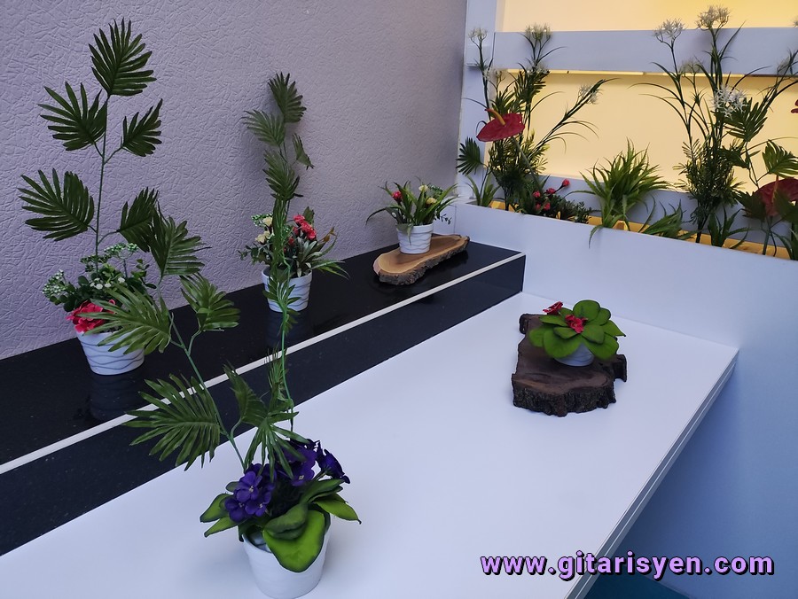 üzerinde duran yapay çiçeklerin oluşturduğu düzen ve ortama kattığı estetik